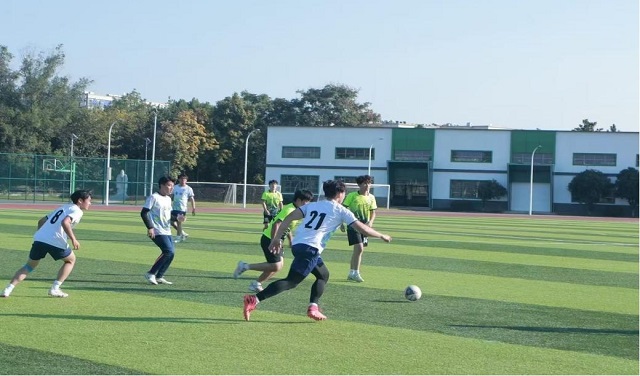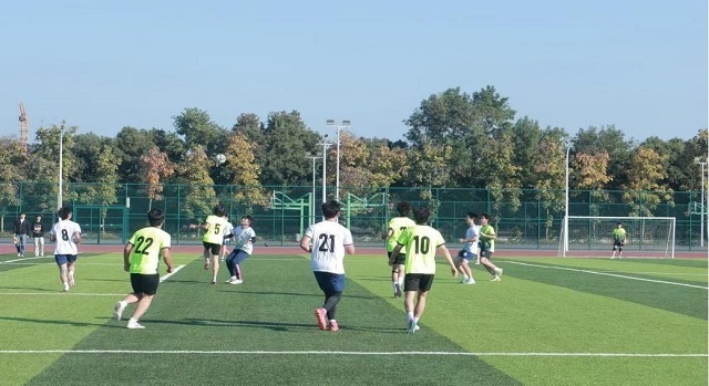 联赛过程十分焦灼,第一场在面对审计学院时,对方前锋攻势迅猛,三番五次冲破我方边路,中路悍将亦步步紧逼,门前险象环生。第二场在对阵会计学院时我方边后卫始终保持高度专注,如铜墙铁壁般坚守阵地,他或用精准的卡位封堵对方突破路线,或用果断的滑铲将球破坏,每一次防守都拼尽全力,汗水顺着脸颊不断滑落。而到了第三场对战管理学院时我方将士鏖战已久,体力渐亏,小腿抽筋的队员稍作拉伸便再度上阵,额角擦伤的队员简单处理后坚守岗位,全程无一人退避——皆咬牙坚守,目光如炬,誓护球门不失。生动诠释了金融学子锐意进取、昂扬向上的精神风采。场边师生呐喊助威声此起彼伏,每一次攻防转换都牵动着全场目光。