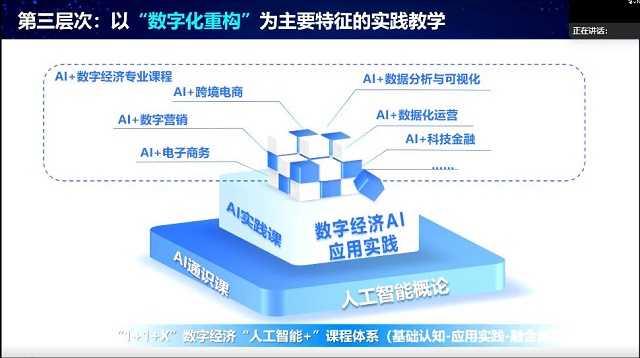 在专家主旨报告环节,浙江师范大学电子商务研究与发展中心主任邹益民教授围绕新时代新商科人才培养展开深入分享。他强调,新技术重构了人才标准,技能的可迁移性与生命周期管理成为核心要求,学科竞赛是培养学生可迁移能力的重要途径。针对数字经济方向的课程体系构建,邹益民教授建议院校需紧密结合国家战略与区域经济发展特色,打造特色课程模块。他提出数字经济实验教学应涵盖基础实训、数据化运营和数字化重构三个维度,倡导以“1+1+X”教学模式融合人工智能,通过“重构”而非简单叠加的方式推动教学模式革新,构建产学用一体化的人才培养生态。