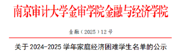 根据《省教育厅等六部门关于印发《<江苏省家庭经济困难学生认定工作实施办法>的通知》(〔2019〕1号)和《南京审计大学金审学院家庭经济困难学生认定工作实施办法》(〔2023〕39号),经学生申请,辅导员和学院审核,学校审定,拟推荐以下学生为家庭经济困难生(附件1),现予公示。