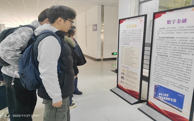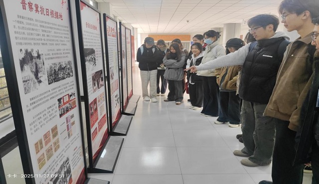 在纪念抗日战争暨世界反法西斯战争胜利80周年之际,为深入学习贯彻二十届四中全会精神,传承红色金融基因,11月27日,金融与经济学院25级保险一班团支部在B东一楼大厅开展“行走的思政课”系列活动,集体参观“筑起抗战的红色金融长城”主题展览。团支部全体师生在历史的回望中,感悟金融背后的精神力量,坚定“金融为民”的初心使命。
