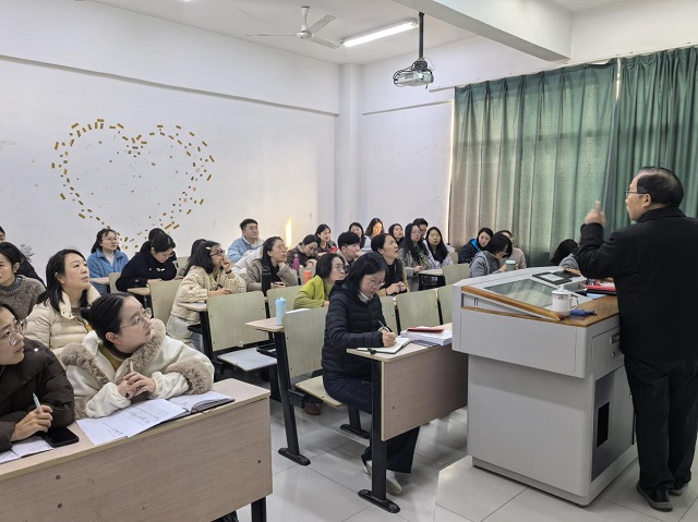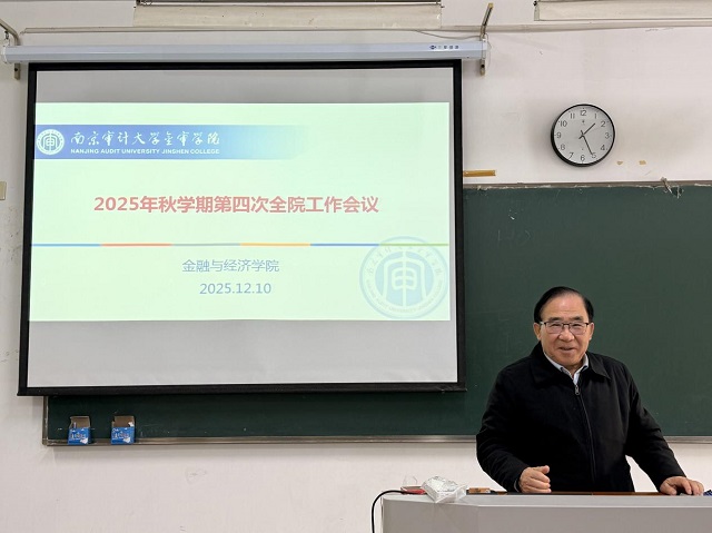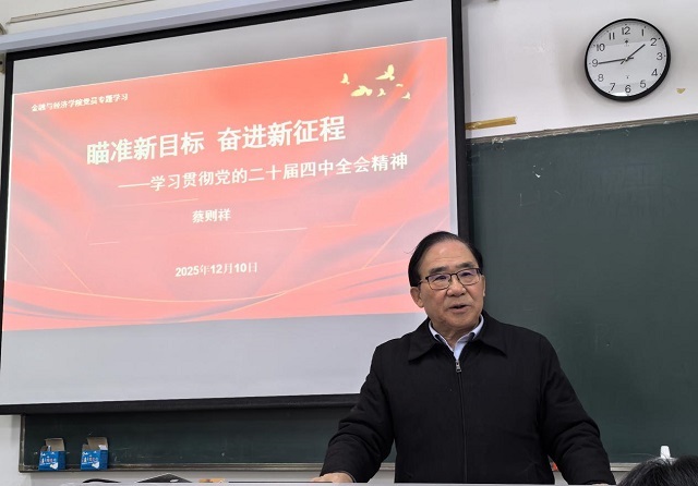 2025年12月10日下午,金融与经济学院秋学期第四次全院工作会议暨党员专题学习会议在B中401教室举行。院长蔡则祥教授主持会议并为全院教职工开展专题学习讲座,学院领导班子及全体教职工参加会议。