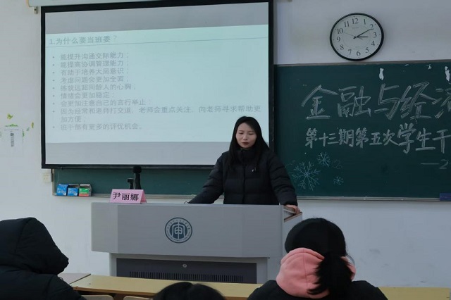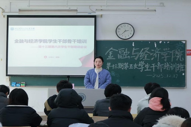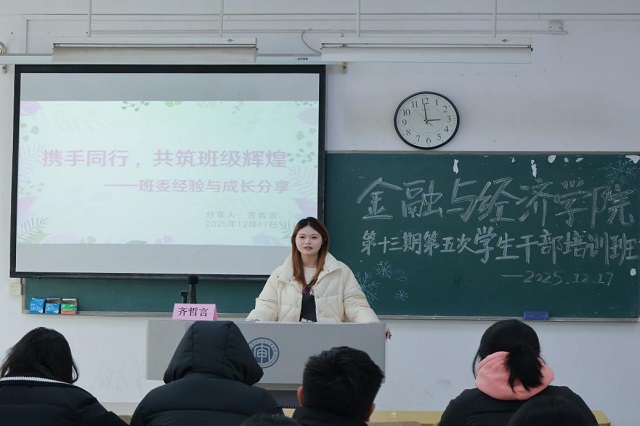 为进一步提升学生干部的综合素养与履职能力,夯实班级管理工作基础,2025年12月17日,金融与经济学院举办第十三期第五次学生干部培训班,多位经验丰富的教师围绕班委工作实务与成长路径开展专题分享,学院全体学生干部积极参与。
