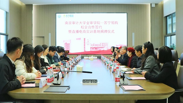 2026年1月15日上午,南京审计大学金审学院与苏宁易购电子商务有限公司举办校企合作签约暨直播电商实训基地揭牌仪式。苏宁易购副总裁党毅、总经理田德铨等企业代表,与南京审计大学金审学院校长俞安平、副理事长侯思画、党委副书记兼副校长王薇等校方领导共同出席仪式,见证这一推动人才培养与行业需求深度融合的关键时刻。此次合作不仅是双方在数字经济时代下的一次重要战略携手,更是应用型本科教育对接产业前沿、响应业态变革的积极探索。