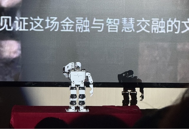 学生主持人王忆薇邀请出一位特殊的主持人——由金融与经济学院联合智径科技打造的金融数字机器人“小智”。这位科技感十足的AI主持人以流畅的智能语音向全场致欢迎辞,展现了科技金融、数字金融的前沿魅力,赢得阵阵掌声。以数智为发展之翼,让AI技术深度融入金融教育场景。